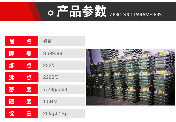 錫錠含量:≥ 99.95% 雜質含量:0.001% 重量:約25kg/塊 性狀: 銀白色金屬,質軟,有良好延展性。 熔點:232℃,密度7.29g/cm3。無毒 。