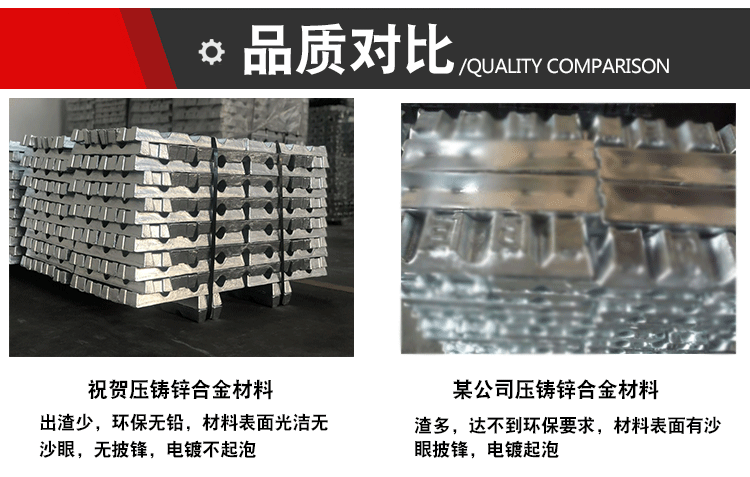 鋅合金是以鋅為主要原料,加入鋁、銅、鎂等金屬元素精確配方熔煉而成。我廠采用優質原鋅,嚴格配方和生產。合金具有不粘模,流動性好,渣少,結晶細且均勻等優點。