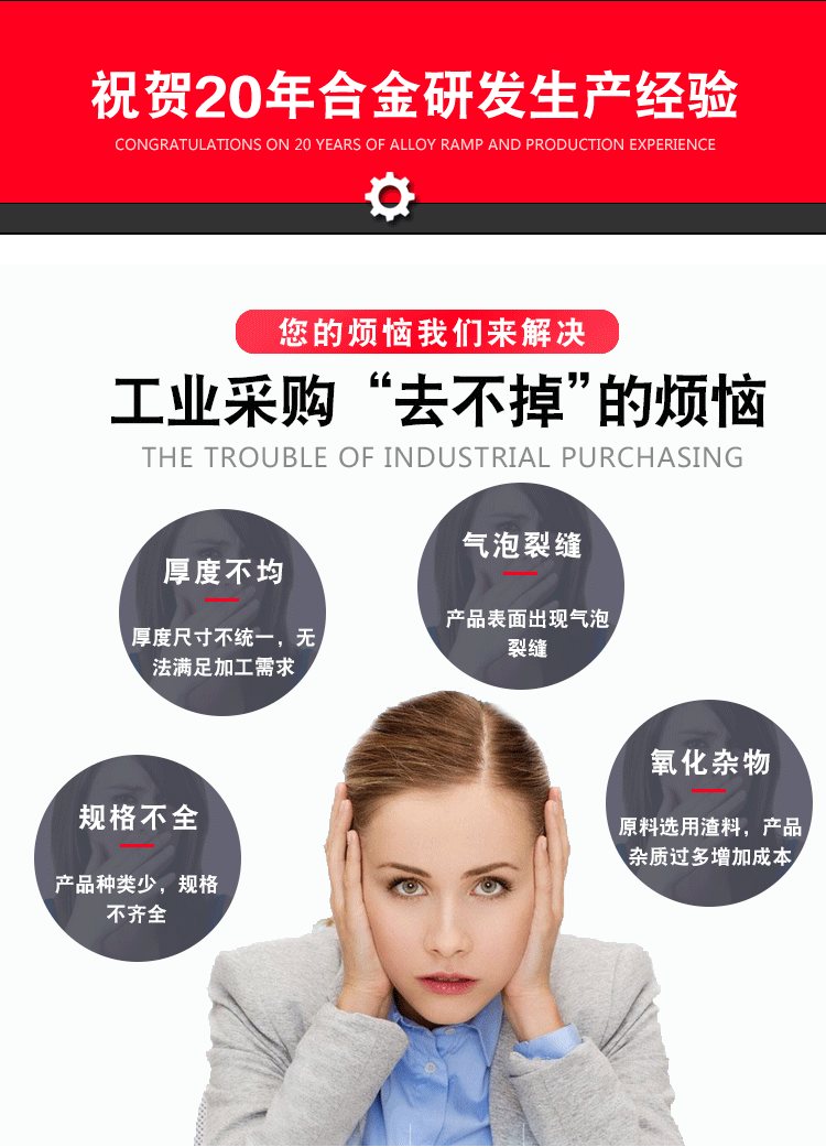 祝賀20年專注合金材料研發生產,產品質量和性能穩定!工廠占地面積8000多平方米,成品生產車間5000平方米,倉庫2000平方米,辦公面積800平方米,樣品室200平方米。 擁有2噸熔爐2臺、35噸,88噸壓鑄機2臺、鑄銅自動化生產設備流水線1條、澆注離心設備1套。